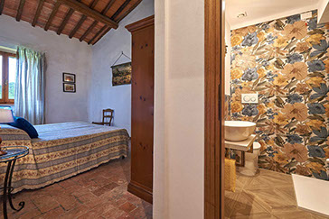 Floor made of original Tuscan cotto of the same age as the building, bathroom with shower, ceilings with wooden beams and cotto slabs.